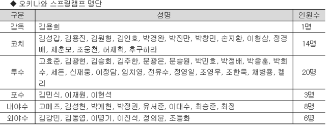 이번 캠프는 일본 오키나와현 구시가와 시영구장에서 실시되며, 감독 및 코칭스태프 15명, 선수 37명 등 총 52명이 참가한다.