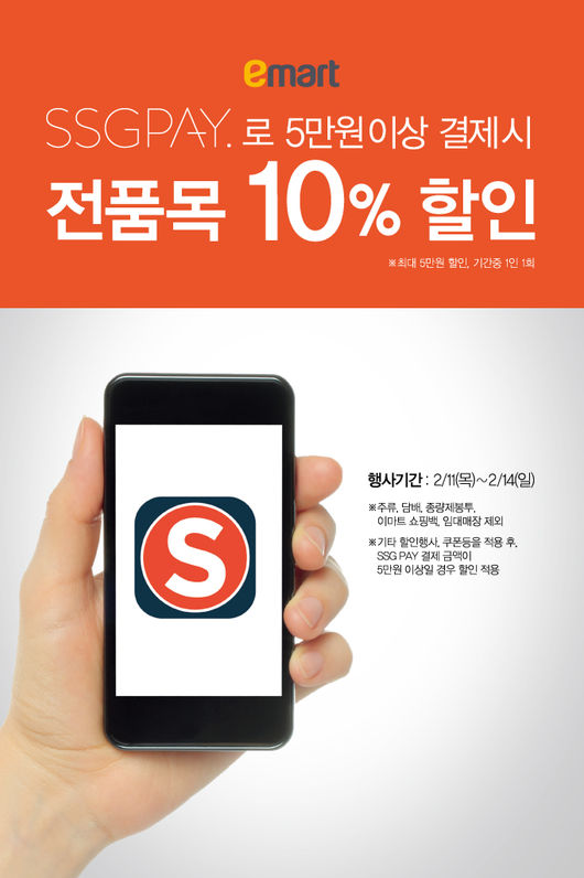 이마트전품목 10% 할인 행사는 11일부터 14일까지 총 나흘간 진행된다. 전국의 이마트에서 SSG페이로 5만 원 이상 결제하면 식료품, 생활용품, 가전제품에 상관없이 10% 즉시 할인 받을 수 있다.(1인 1회 한정, 최대 5만 원 할인)