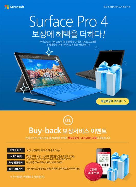 한국MS에 따르면 이날부터 3월 말까지 보유하고 있는 애플 맥북, 맥북에어, 맥북프로, 아이맥 등 중고 애플 노트북 및 아이패드나 구형 서피스를 반납하면 서피스 프로 4를 더욱 경제적인 가격에 구매할 수 있는 보상판매 프로모션이 진행된다. 보유 중인 중고 맥북 및 서피스는보상 금액에 7만 원,아이패드는 5만 원의 추가보상 혜택이 제공되며, 3만 원 상당의 문화상품권 혹은 백화점 상품권이 함께 제공된다.