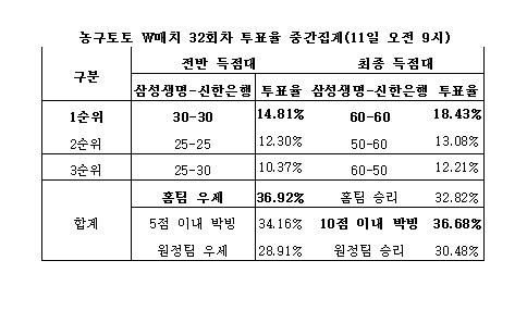 자세한 투표율을 살펴보면, 홈팀 삼성생명의 승리를 예상한 참가자는 32.82%였고, 원정팀 신한은행의 승리에 투표한 참가자는 30.48%로 집계됐다.