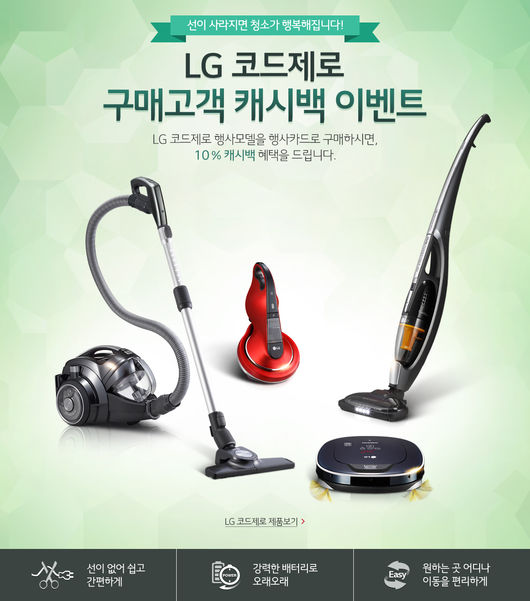 이달 29일까지 전국 베스트샵을 통해 진행되는 이번 행사에서 LG전자는 코드제로 청소기 구매자에게 구매 금액의 10% 캐시백 혜택을 제공할 예정이다. 참가를 원하는 소비자는 KB국민카드(신용카드만 해당)를 이용해 제품을 구매하면 된다.