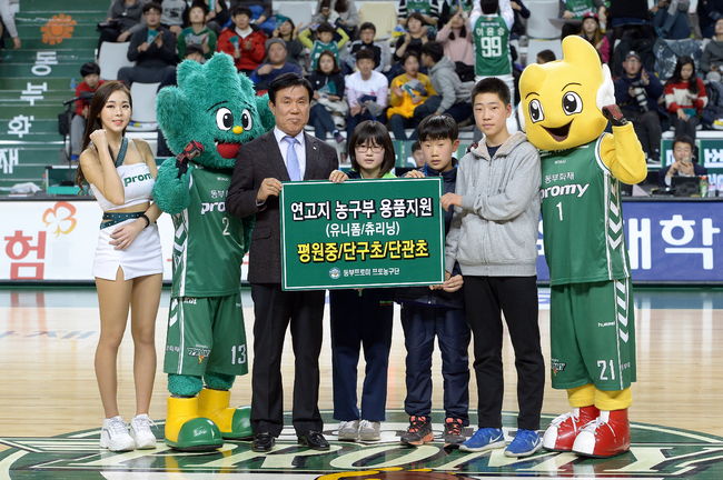 동부는 지난 10일 홈경기에 앞서 연고지 원주에서 농구를 하고 있는 평원중, 단구초, 단관초 3개 학교에 약 1600만 원 상당의 유니폼과 트레이닝복 등 훈련용품을 전달했다. 동부는 연고지 아마추어농구의 체계적인 육성을 지원하기 위해 매년 훈련용품을 후원해오고 있다.