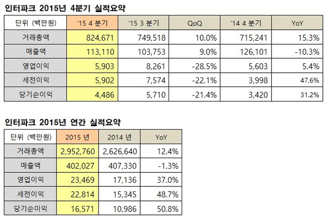 인터파크는 2015년 4분기 및 연간 실적을 12일 공정공시를 통해 발표했다.