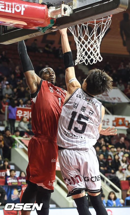 12일 오후 경기도 안양시 안양실내체육관서 열린 '2015-2016 KCC 프로농구' 안양 KGC와 창원 LG의 경기,4쿼터 KGC 로드가 덩크슛을 성공시키고 있다.