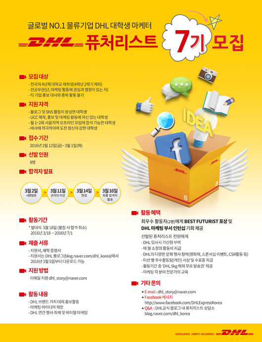 국제특송기업 DHL코리아는 12일부터 3월 1일까지 대학생과의 소통 강화 및 국제 감각을 갖춘 인재 육성을 위해 대학생 홍보대사 ‘DHL 퓨처리스트(Futurist)’ 7기를 모집한다.