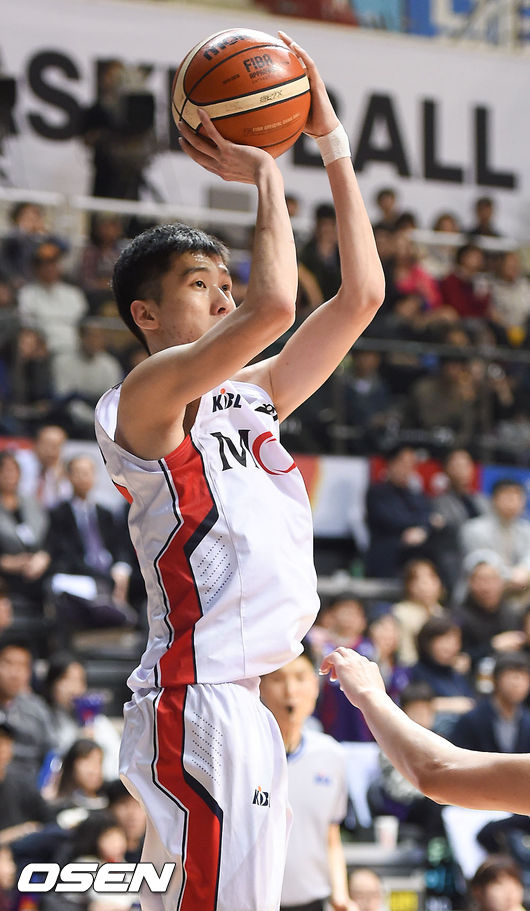 13일 오후 경기도 고양시 고양실내체육관서 열린 '2015-2016 KCC 프로농구' 고양 오리온과 울산 모비스의 경기, 3쿼터 모비스 전준범이 3점슛을 성공시키고 있다.
