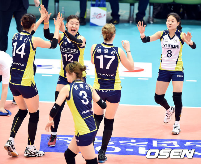 13일 오후 수원 실내체육관에서 열린 '2015-2016 NH농협 V-리그' 여자부 현대건설과 도로공사의 경기 1세트 현대건설 에밀리가 득점에 성공, 팀원들과 기뻐하고 있다.