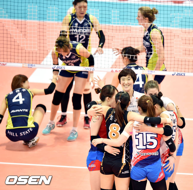 13일 오후 수원 실내체육관에서 열린 '2015-2016 NH농협 V-리그' 여자부 현대건설과 도로공사의 경기 1세트 도로공사 시크라가 득점에 성공, 팀원들과 기쁨을 나누고 있다.