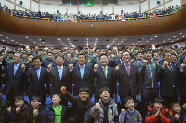 전북 현대가 14일 전라북도청 대강당에서 2016 시즌 출정식을 가졌다. 이날 출정식이 열린 대공연장은 1500여명의 전북 팬들이 찾아 가득 채웠다. 500여명의 팬들이 더 출정식을 찾았지만, 대공연장에 발을 내딛을 곳조차 없어 발길을 돌려야 했다.