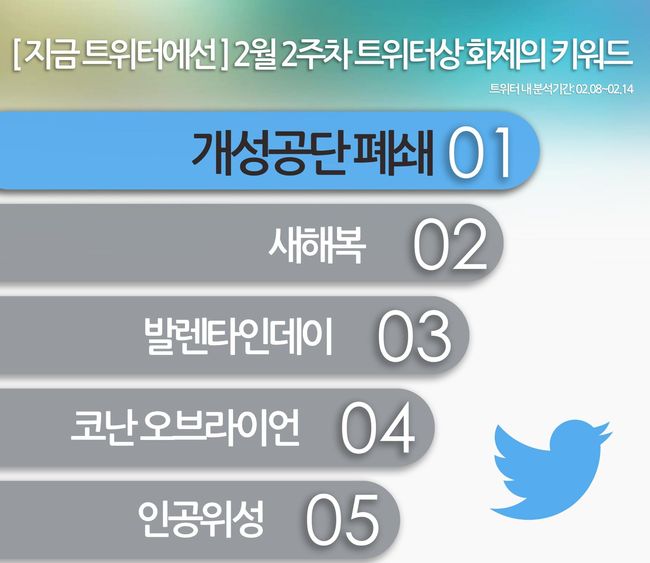 지난 10일, 정부의 개성공단 가동 전면 중단선언에 이어 북한이 공단폐쇄와 남측자산을 동결조치하는 초강수를 꺼내들면서 ‘개성공단폐쇄’ 키워드가 금주의 트위터 핫키워드 1위에 이름을 올렸다.