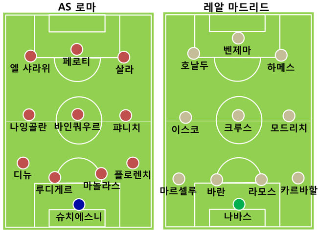 반면 AS 로마는 슈팅은 3개에 그쳤지만 대부분의 슈팅이 위협적이었다. 모하메드 살라의 측면 침투와 디에고 페로티의 문전 쇄도는 레알 마드리드의 수비진을 흔들었다. AS 로마는 전반 12분과 전반 16분, 전반 23분, 살라와 페로티를 활용한 공간 침투와 슈팅을 시도했다.