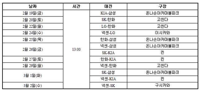 모바일 생중계는 오는 2월 19일 오키나와 온나손아카마볼파크에서 열리는 KIA와 삼성의 경기를 시작으로 총 12경기가 편성되었으며, 경기는 모두 오후 1시에 개시될 예정이다.