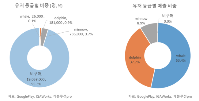 고래 이용자(53.4%, 2만 6000명)와 돌고래 이용자(37.7%, 18만 1000명)가 전체 매출의 91.1%를 차지했다. 전체 이용자를 놓고 봤을 때 고래 이용자는 0.1%, 돌고래 이용자는 0.9%로 모두 합쳐 1%에 불과하지만, 이들로부터 모바일게임 매출 대부분이 발생했다.