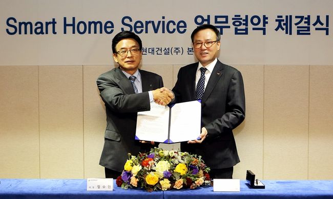 이날 현대건설 계동사옥에서 진행된 협약식에서는 SK텔레콤 장동현 사장과 현대건설 정수현 사장 등 관계자들이 참석해 현대건설의 지능형 아파트 구축을 위해 스마트홈 기술을 바탕으로 지속 협력하기로 합의했다.