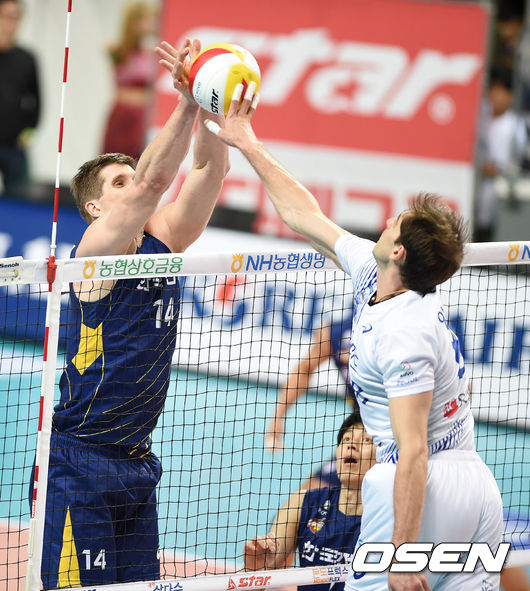 2세트 한국전력 얀 스토크가 우리카드 알렉산더를 블로킹하고 있다.