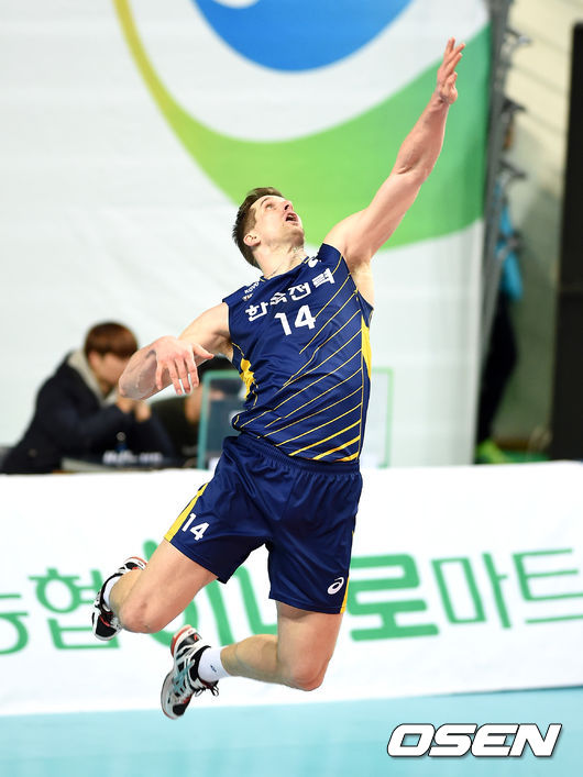 2세트 한국전력 얀 스토크가 서브를 넣고 있다.