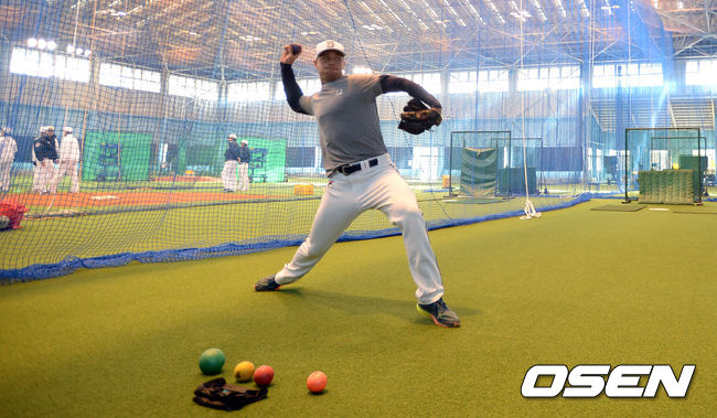 [오!쎈 캠프영상]'우완' 보우덴,'밸런스 감각 위한 왼손투구'