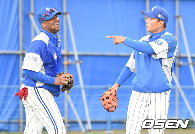 [오!쎈 캠프영상]발디리스,'이승엽-구자욱과 화기애애한 훈련'