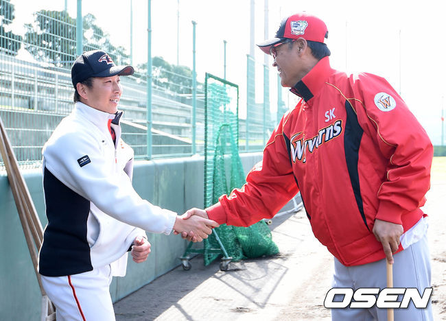 21일 오키나와 고친다 구장에서 한화와 SK와의 경기가 열리기 전, 한화 유니폼을 입은 한 선수가 SK 덕아웃을 찾았다. 올해 한화로 이적한 정우람(31)이었다.