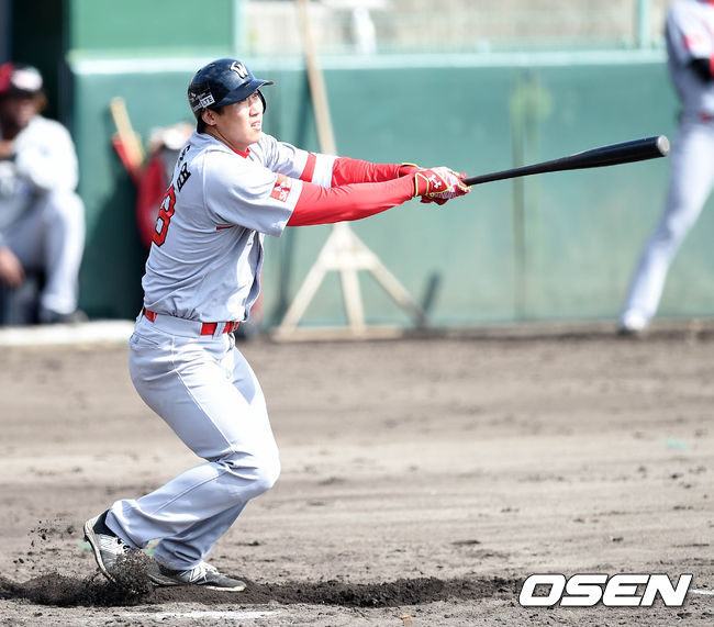 김동엽은 21일 일본 오키나와 고친다 구장에서 열린 한화와의 연습경기에서 선발 6번 좌익수로 이름을 올렸다. 그간 지명타자로 간간히 출전했지만 이날은 처음으로 수비 포지션에도 나가며 선발 출장했다. 그리고 의미 있는 한 방을 터뜨렸다.