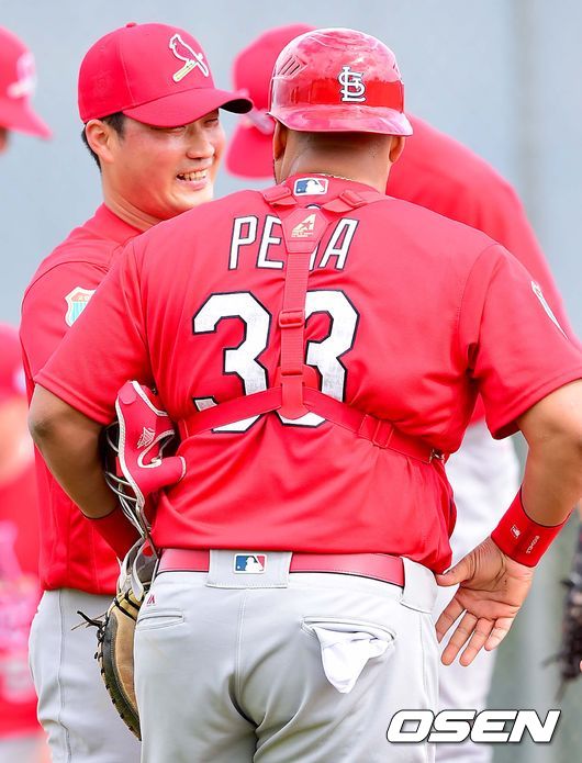 페냐는 22일(이하 한국시간) 미국 플로리다주 주피터 로저스 딘 스타디움에서 열린 스프링 트레이닝 4일차 훈련에서 오승환과 배터리를 이뤘다. 오승환은 지난 20일 첫 불펜투구에선 초청 선수 에릭 프레이어와 배터리를 이뤘다. 이날은 몰리나 대신 개막전 선발 포수로 뛸 가능성이 높은 페냐가 오승환의 공을 받았다.