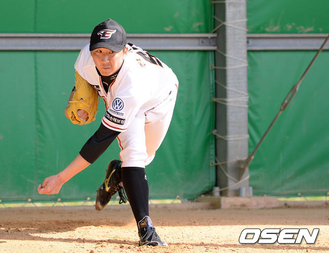경기에 앞서 불펜 피칭에 임한 한화 정우람이 김성근 감독의 지도를 받고 있다. /sunday@osen.co.kr