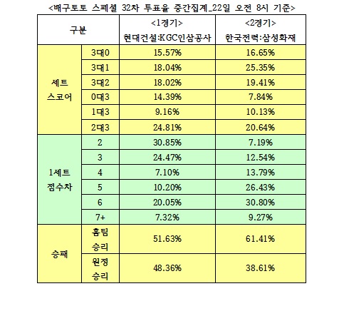 한편, 삼성화재의 승리 예상은 38.61%로 나타났고, 최종 세트스코어에서는 3-1 한국전력 승리(25.35%) 예상이 가장 높게 나타났다. 또 1세트 점수차 예상에서는 6점차(30.80%)가 1순위로 집계됐다.