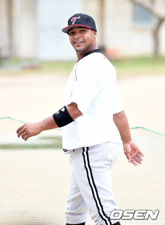 LG 히메네스가 미소를 지으며 훈련장으로 이동하고 있다.