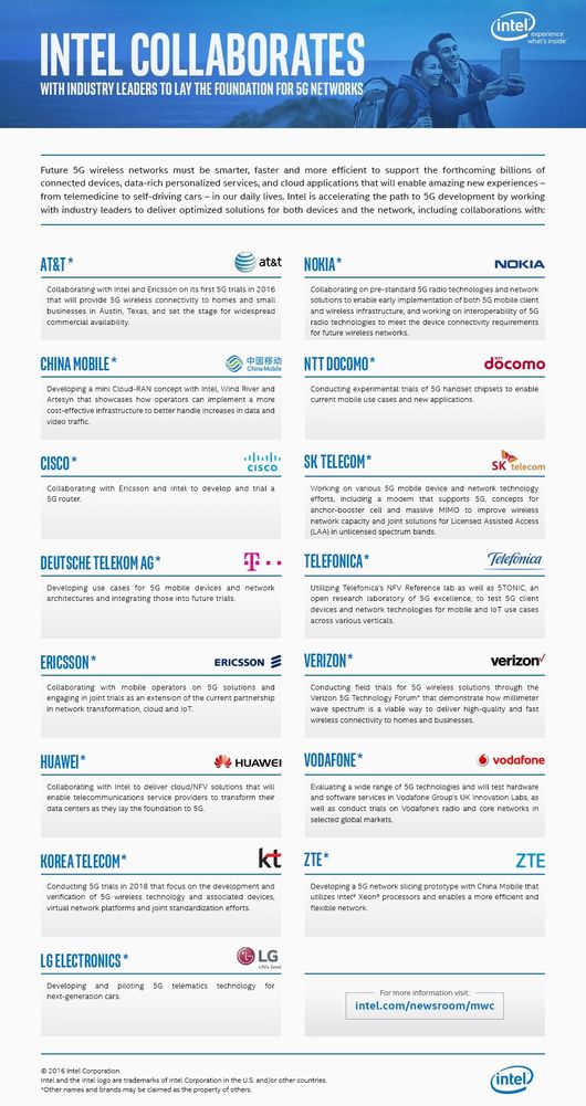인텔은 5G 상용화가 빠르게 확산될 수 있도록 모바일 에코시스템 분야 선두 기업들과 협력을 발표했다. 우선 에릭슨(Ericsson)과는 네트워크 전환, 클라우드 및 IoT 분야 양사간 협업에 더해 5G 솔루션 개발 및 공동 테스트와 관련해 모바일 서비스 업체와 협력 중이며, KT와는 2018년에 5G 무선 기술 및 관련 디바이스, 가상화 네트워크 플랫폼, 그리고 공동 규격을 개발하고 검증하게 될 5G 시범 서비스를 시행할 예정이다.