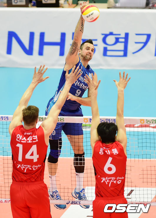 23일 오후 경기도 수원시 장안구 수원실내체육관서 열린 '2015-2016 NH농협 V-리그' 남자부 한국전력과 삼성화재의 경기, 삼성화재 그로저가 강타를 날리고 있다.