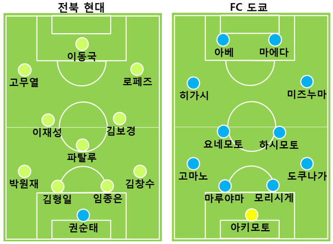 이렇다 할 모습을 보이지 못한 도쿄는 설상가상 부상자까지 나왔다. 전반 20분 수비수 고마노 유이치가 몸이 좋지 않은지 곤노 슈토와 교체됐다. 반면 전북은 전반 22분 김보경의 프리킥을 로페즈가 헤딩 슈팅으로 연결하는 등 선제골을 위한 공격을 지속적으로 시도했다.
