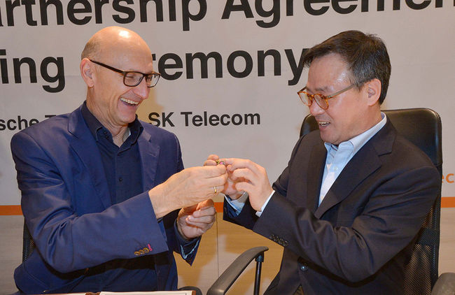 [사진] SK텔레콤 장동현 사장(오른쪽)과 도이치텔레콤 팀 회트게스 사장이 양사를 상징하는 배지(badge)를 교환하고 있다. /SK텔레콤 제공