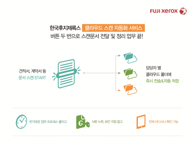 한국후지제록스는 23일 복잡했던 스캔문서 전달 및 정리 업무를 버튼 두 번으로 끝낼 수 있는 ‘클라우드 스캔 자동화 서비스’를 출시했다고 밝혔다.
