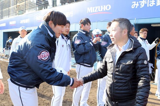 박 구단주는 24일 일본으로 출국해 곧바로 미야자키의 아이비구장으로 가 소프트뱅크 호크스와 연습경기를 치른 선수단을 격려했다. 김태형 감독과 주장 김재호를 비롯한 선수들과 한 명씩 악수를 하며 인사했다.