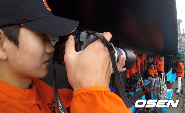 롯데 자이언츠 김대륙이 24일 오후 일본 가고시마 가모이케 구장에서 훈련 중 구단 홍보팀의 카메라를 들고 사진을 찍고 있다.