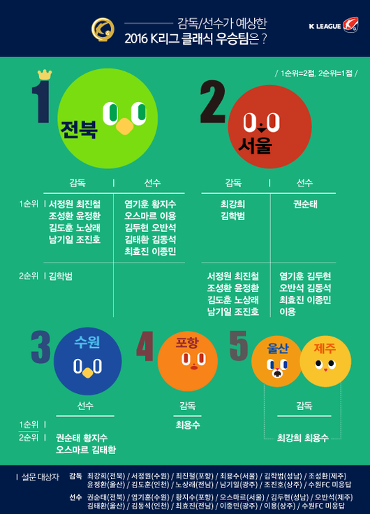 설문에 답변한 감독과 주장 중 전북 소속 최강희 감독과 권순태를 제외하고 전북을 1순위에 꼽지 않은 답변자는 최용수 서울 감독, 김학범 성남 감독이 유일했다. K리그 클래식 9개 구단의 주장들은 모두 전북을 우승 후보 1순위로 꼽았다.