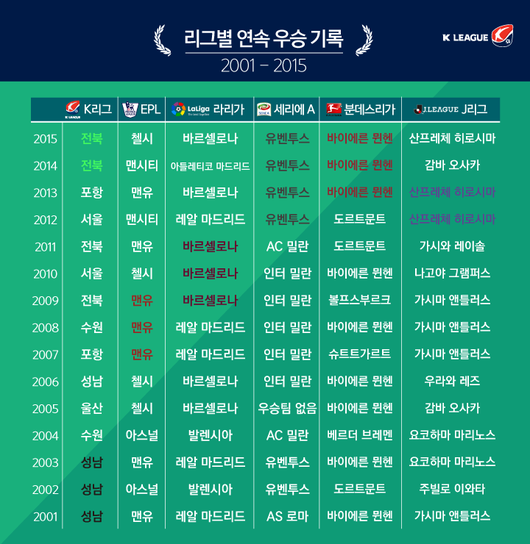 스페인 프리메라리가는 가장 최근 2008-09시즌부터 2010-11시즌까지 세 시즌 동안 바르셀로나가 연속 우승을 차지한 후 4년간 연속 우승이 없었다. 일본 J리그는 산프레체 히로시마가 2012, 2013시즌 2년 연속 우승을 차지했지만 2014년에는 감바 오사카가 우승컵을 들어 올리며 우승 독주가 멈췄다. 산프레체 히로시마는 2015년 또 다시 챔피언의 자리에 올라 아쉬움을 달랬다.