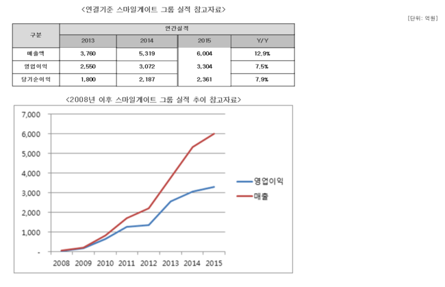 스마일게이트는 지난 2014년에 이어 2015년 역시 전체 매출 기준으로 국내 게임업계 톱 5를 기록했으며, 영업이익은 넥슨에 이어 2위를 달성했다. 지난해 영업이익률은 55%로 지난 2009년 이래로 7년 연속 50% 이상을 기록하기도 했다.