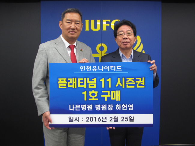 인천유나이티드 프로축구단(대표이사 박영복)이 출시한 명품 시즌권 ‘2016 플래티넘 11’ 1호 구매자가 탄생했다. 루가의료재단 나은병원(병원장 하헌영)은 25일 ‘플래티넘 11’ 시즌권 구매 계약을 체결했다.