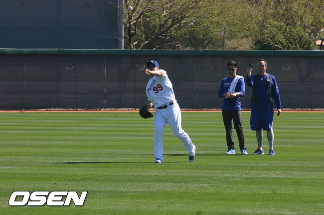 26일 애리조나주 글렌데일 카멜백렌치에서 이어진 스프링 트레이닝. 류현진은 이날도 트레이너와 짝을 이뤄 캐치볼과 롱토스를 수행했다. 원래 볼을 받아줘야 할 스티브 칠라디 불펜 포수가 같은 시각 페드로 바에즈와 캐치 볼을 해야 했기 때문이다.