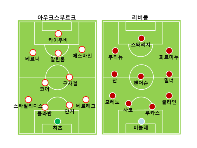 리버풀은 쿠티뉴, 스터리지, 피르미누가 앞선을 구축했다. 중원은 찬, 헨더슨, 밀너가 지켰다. 포백 라인은 모레노, 사코, 루카스, 클라인이 형성했다. 골키퍼 장갑은 미뇰레가 꼈다.