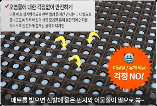 이 제품은 종전의 매트가 신발로부터 떨어진 각종 먼지를 그대로 품고 있다는 데서 착안했다. 자주 세탁을 하지 않으면 매트 자체가 먼지 덩어리가 되기 쉽다.