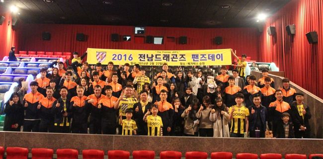 전남 드래곤즈(사장 박세연)가 지난 27일 메가박스 순천점에서 '2016 전남드래곤즈 팬즈데이' 를 통해 팬들과 영화를 함께 보며 하나가 됐다. 이날 행사에는 전남 선수단 전원과 선착순으로 접수한 팬 70여명이 참여했다.