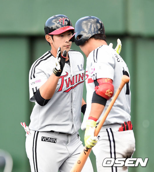 2회초 LG 강승호가 솔로 홈런을 치고 홈에서 정성훈과 하이파이브를 하고 있다.
