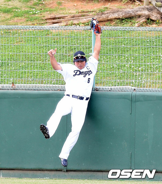 1회초 2사에서 주니치 히라타가 LG 정성훈의 홈런성 타구를 잡아내고 있다.