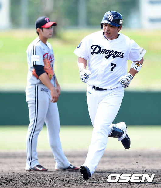 3회말 주니치 모리노가 솔로 홈런을 치고 그라운드를 돌고 있다.