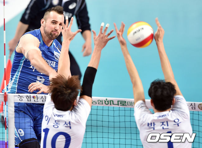 28일 오후 서울 장충체육관에서 열린 '2015-2016 NH농협 V-리그' 남자부 우리카드와 삼성화재의 경기 1세트 삼성화재 그로저가 공격을 시도하고 있다.