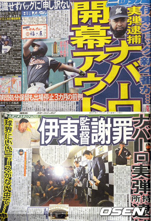 일본 현지 매체에 따르면 지바롯데가 나바로에게 1,2군 시즌 개막 후 4주 출전 정지와 제재금 50만 엔 처분을 내렸다. 나바로는 지난달 21일 오키나와에서 미야자키로 이동하던 중 가방에서 실탄이 발견돼 공항에서 구속 처분을 받았다가 석방됐다.