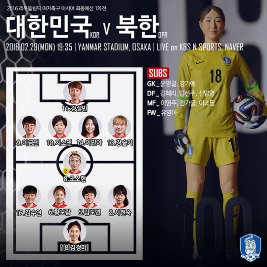 북한을 상대하는 한국은 최전방에 정설빈을 배치하고 2선에 이금민과 지소연, 이민아, 장슬기를 배치해 지원 사격에 나선다. 수비형 미드필더로는 조소현이 출전했다.