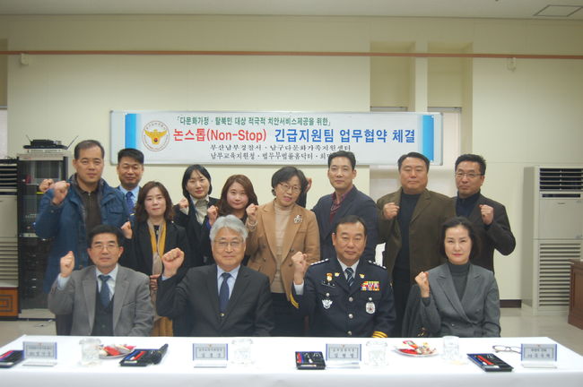 부산남부경찰서는 29일 남부교육지원청, 다문화가족지원센터, 희망의 전화 등과 함께 다문화가정·탈북민 위기해결 '논스톱(Non-Stop) 긴급지원팀' 운영을 위한 업무협약을 체결했다.